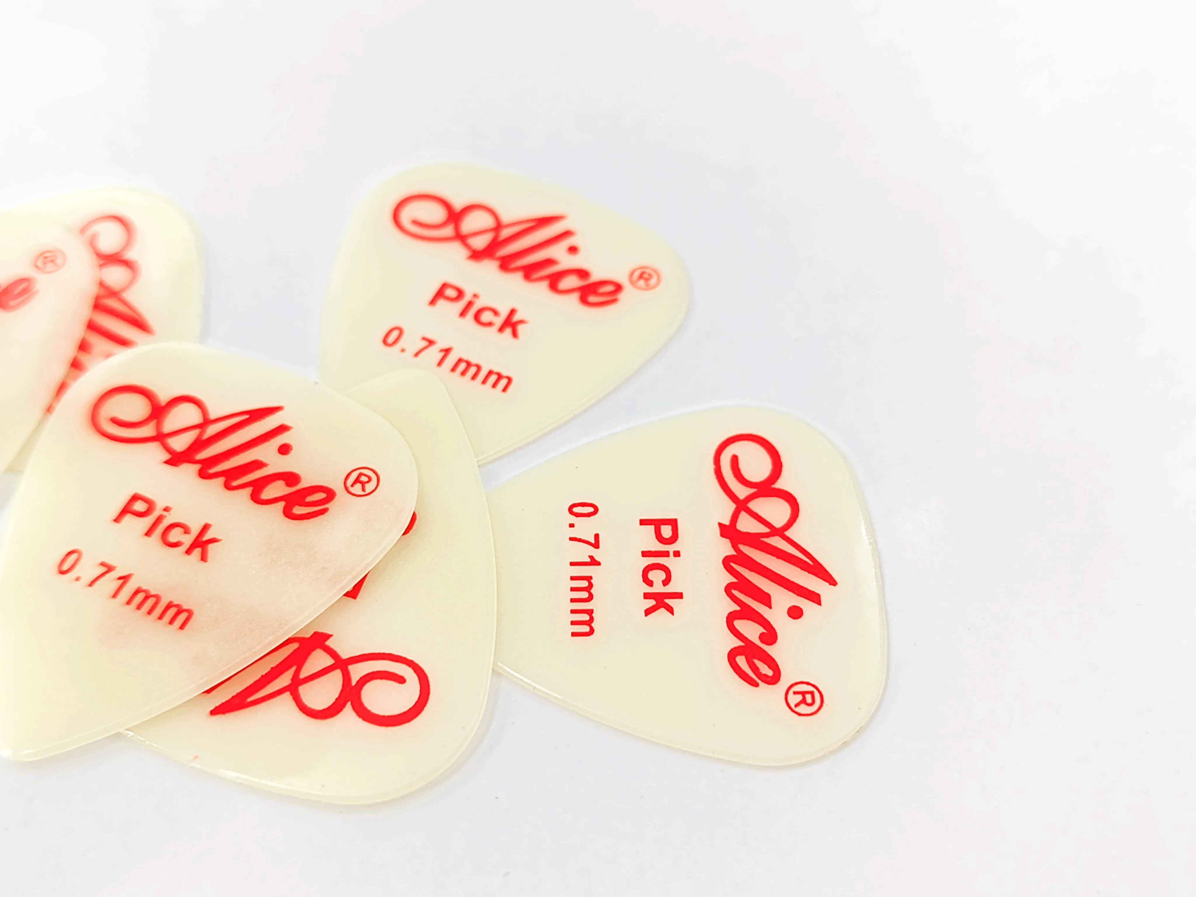 夜光拨片在黑暗中发出神秘的绿色光芒,为您的表演增添独特风格。赛璐珞吉他拨片由赛璐珞片材制成,这是一种广泛使用的合成塑料材料。它们表面光滑、色彩鲜艳且耐用。