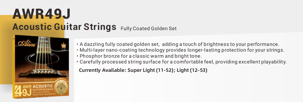 The Alice Acoustic Guitar String Set AWR49J gives you a plated collection of strings that features high-quality materials. A nano-coating on the strings helps to reinforce and strengthen them, ensuring they last for a long time. At the same time, the exceptional design of the strings also gives you a great performance on your acoustic guitar. Check out more tips about using or choosing acoustic guitar strings on our website!