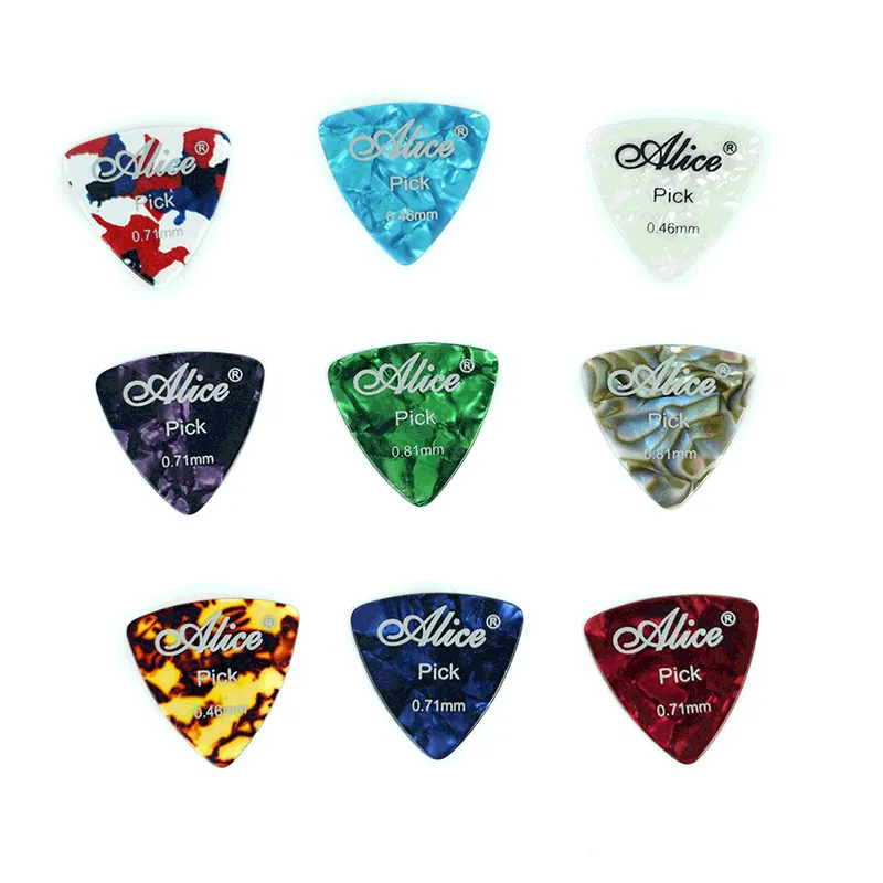 Alice celluloid guitar picks are made from sheets of celluloid, a widely used synthetic plastic material. They are smooth, vibrant, and durable. These picks come in multiple thicknesses and pack options.