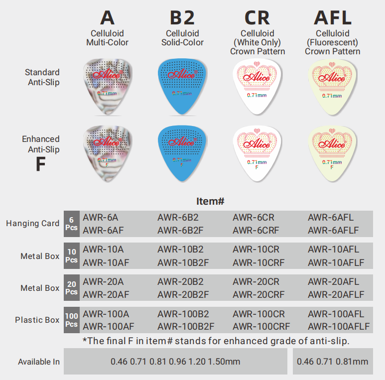 ü Alice guitar picks come in various colors and patterns, e.g., White Pearl, Purple Pearl, Green Pearl, Chinese Zodiac Pattern, Monster Pattern, etc.